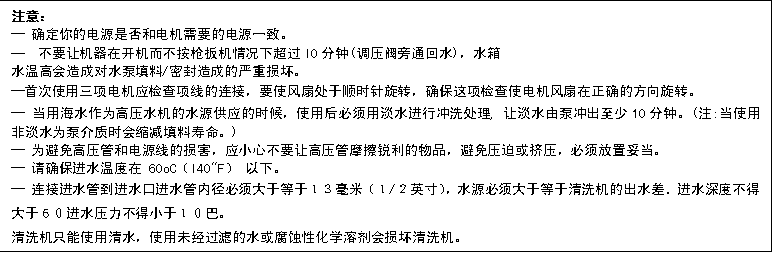 8在每次停止高壓操作關掉主機后,請先扣槍柄扳機,把系統壓力釋放掉。若需要把配件如進水軟管,高壓管或槍管拆下,請務必將其接頭清潔干凈然后用干凈的塑料布/袋封好,以防沙石等異物進入,于再度操作時損壞水泵,槍把及槍頭。